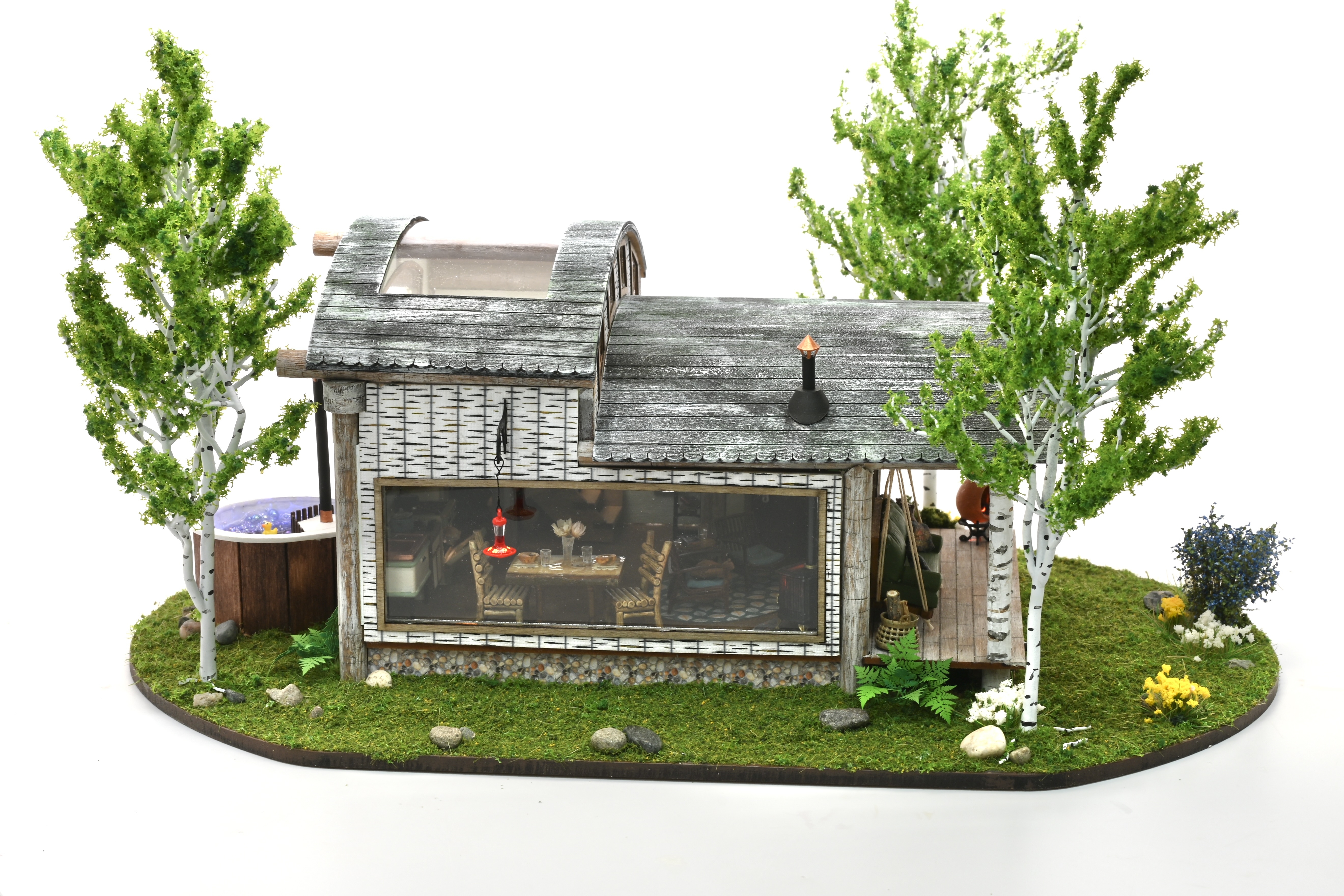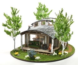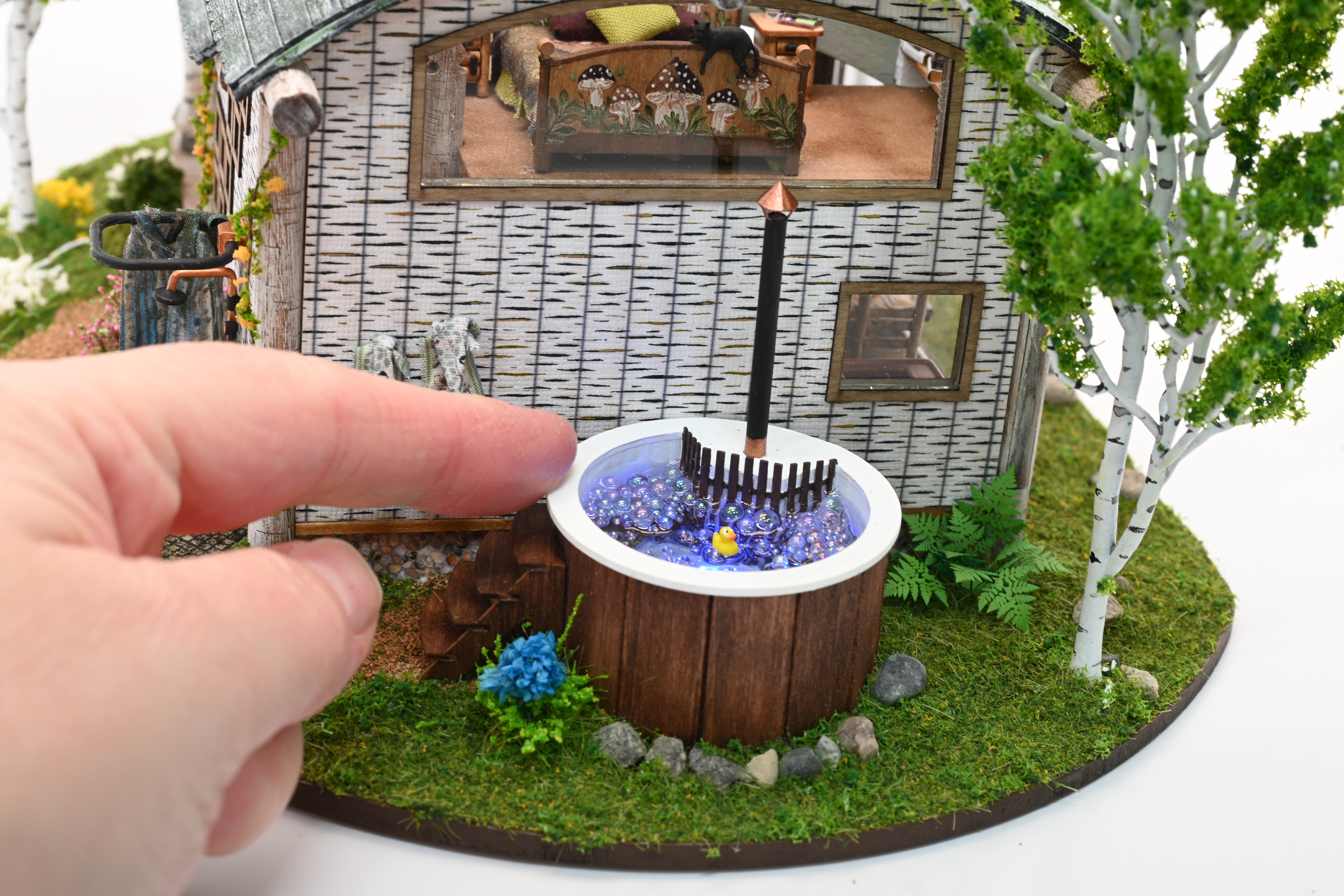 We have a brand new house kit that is absolutely cute and so much fun to assemble and finish! The house kit comes with the base, laser cut textured wallpaper for the logs for the outside, laser cut flooring for the inside and the complete bathroom kit since kit needs to be build into the house. It also comes with the 2 mushroom sconces and lighting with battery pack for them. The side wall swings open and the roof above the bedroom is a glassed in skylight. There are so many pieces in this kit you will giggle as you make each one. These were all newly designed for this special tiny house in an Aspen Grove.