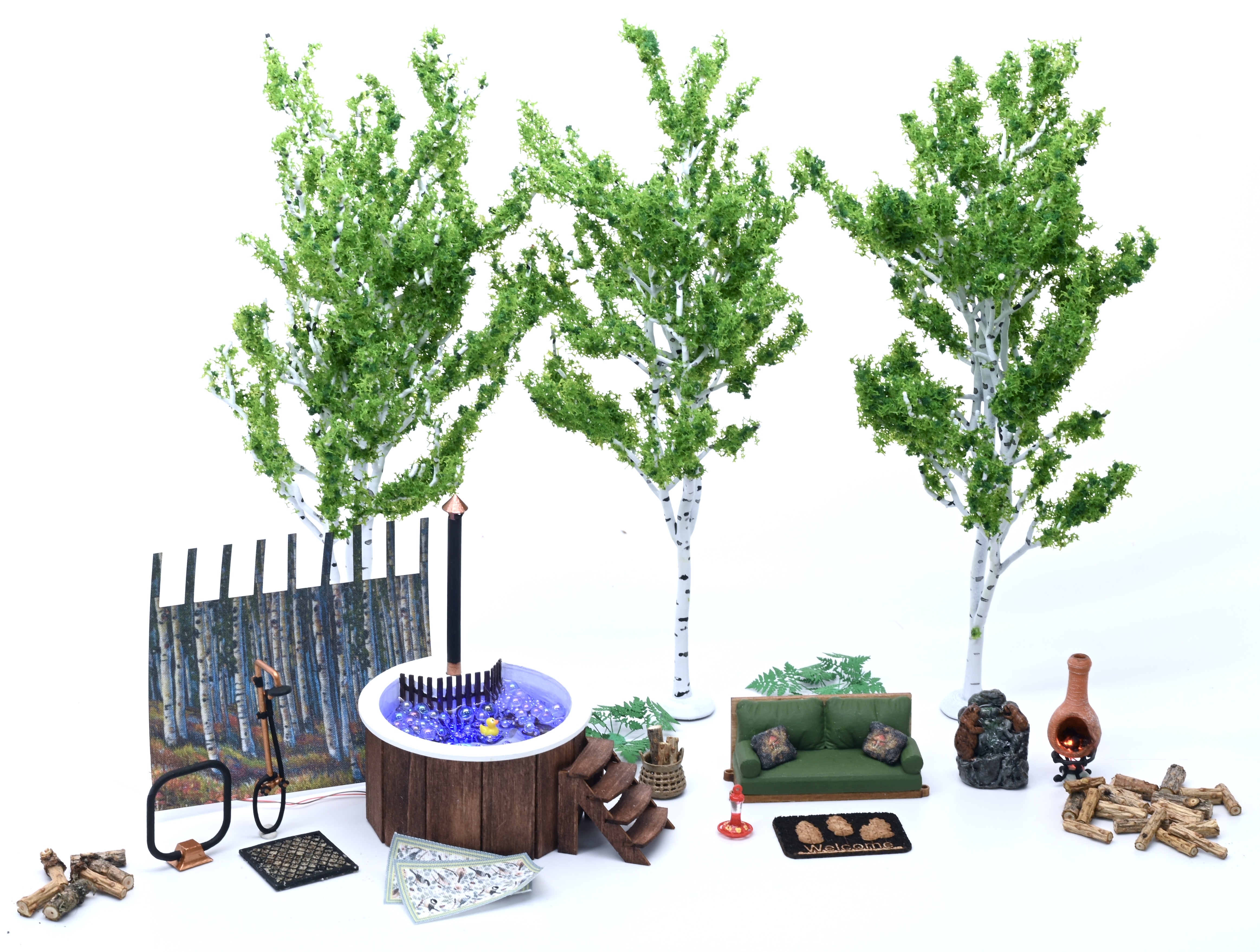 Outdoor shower kit, hot tub kit with lighting, hot tub towels, welcome mat, hanging porch couch, bear fountain, chiminea with lighting, basket for logs, humming bird feeder, skunk, (All landscaping supplies are included), ferns, grass, gravel, flowers, bushes, 3 aspen tree kits, logs.