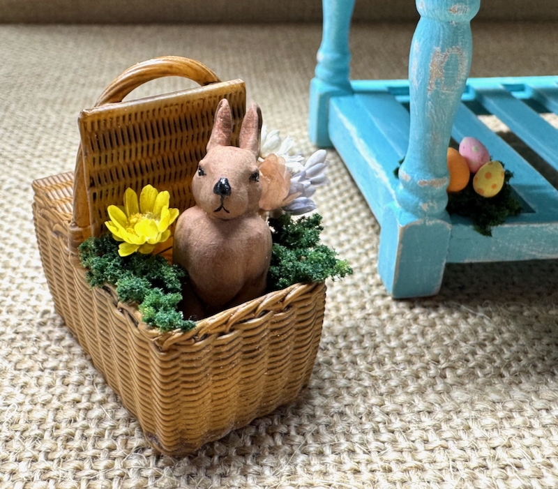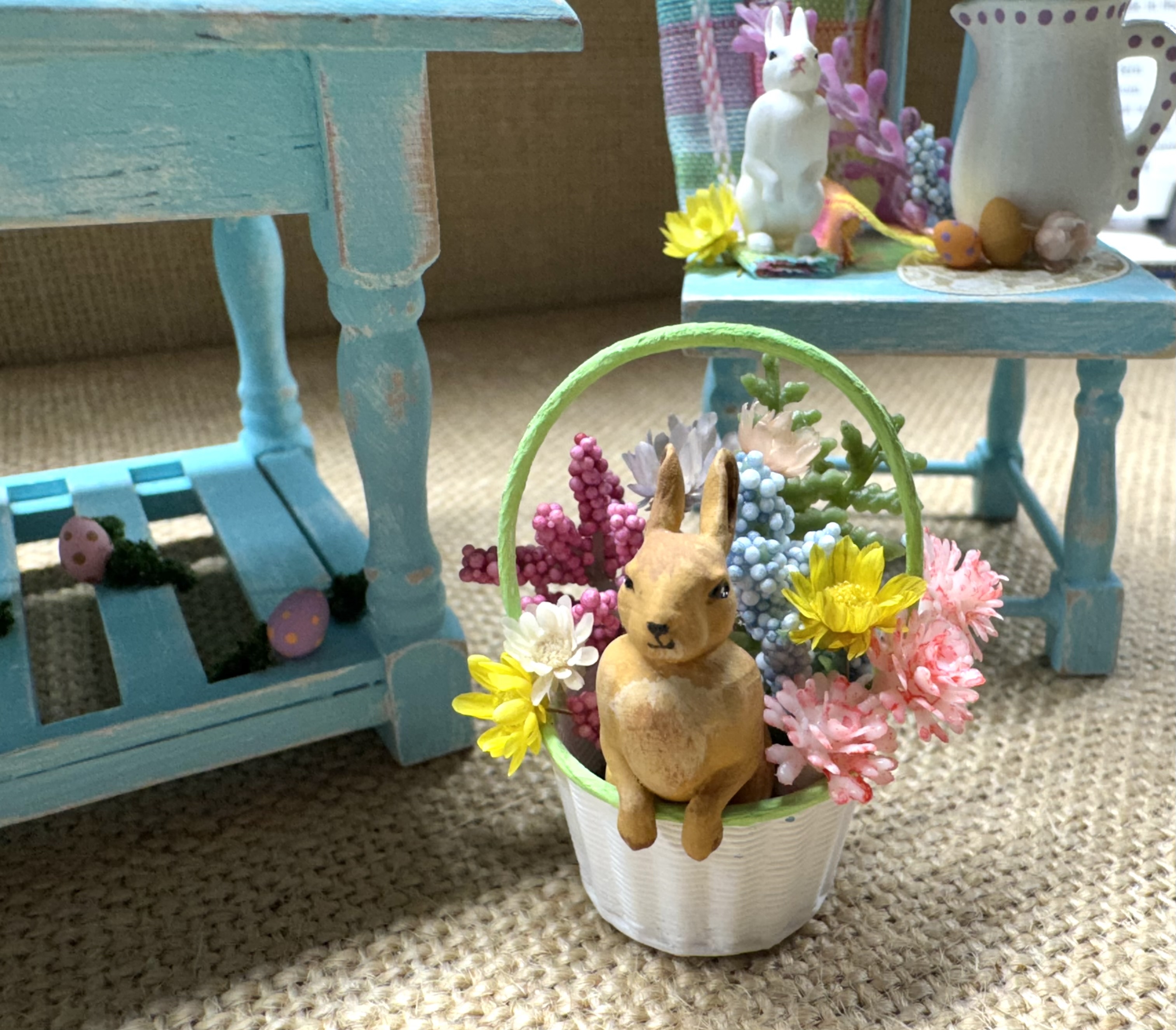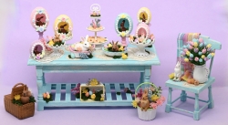 Class comes with a  premade table & chair that you will learn how to paint and distress to make it look worn. You get all the new baskets, bunnies, stands, eggs, frosting, glass glitter, greenery, doilies, eggs, flowers, new cake stands and new pastry stand. You will get 3 molds with this kit too! The 1:12 Chocolate Bunny Mold (if you have it let me know you can get another mold for the same price in it's place), the new Tea Cookies Mold and a Brand New Jammy Doggers Cookie Mold! You will learn how to make roses and leaves as well.