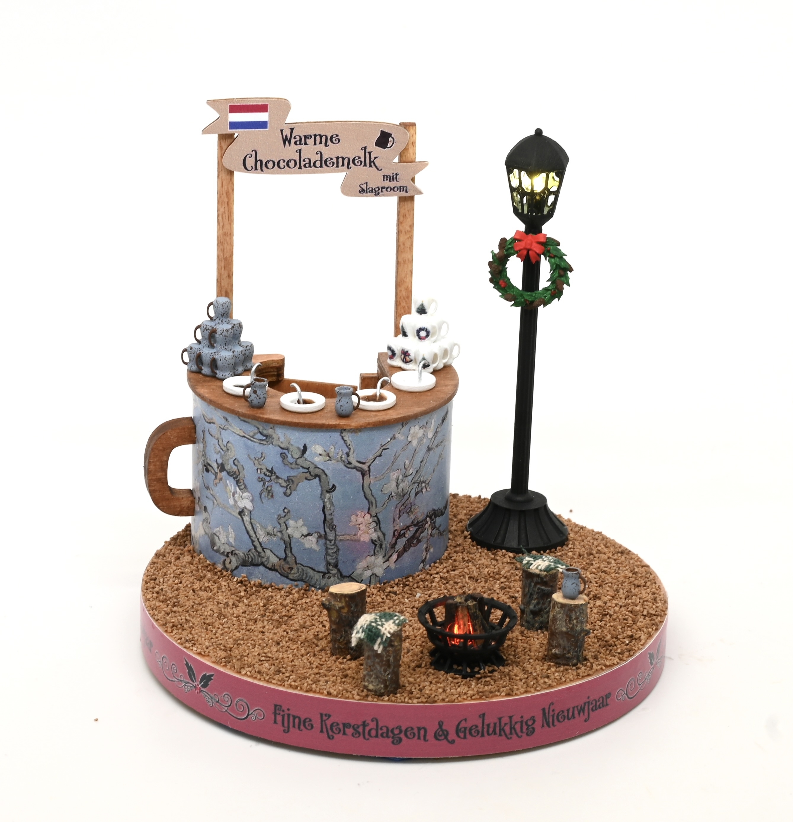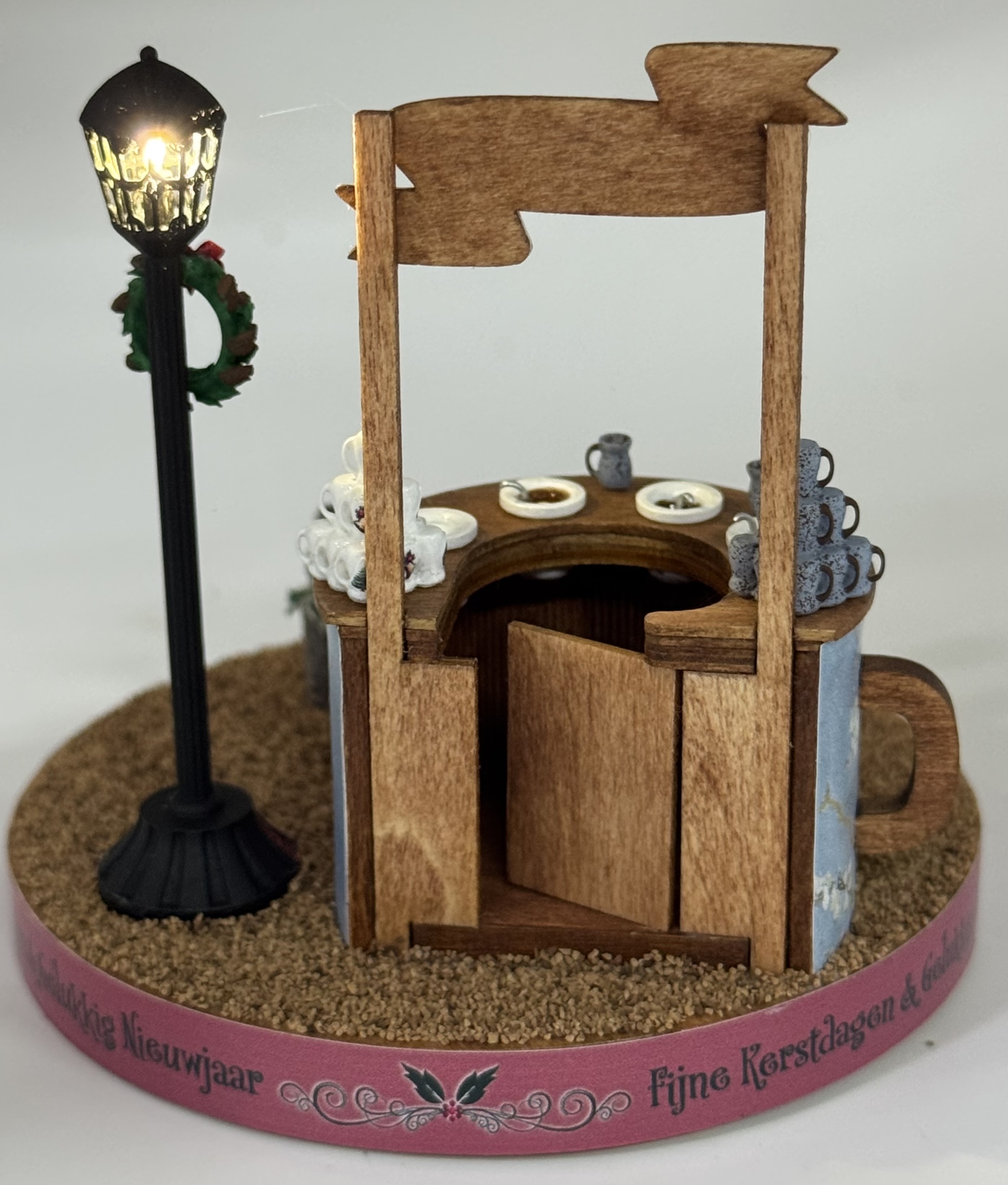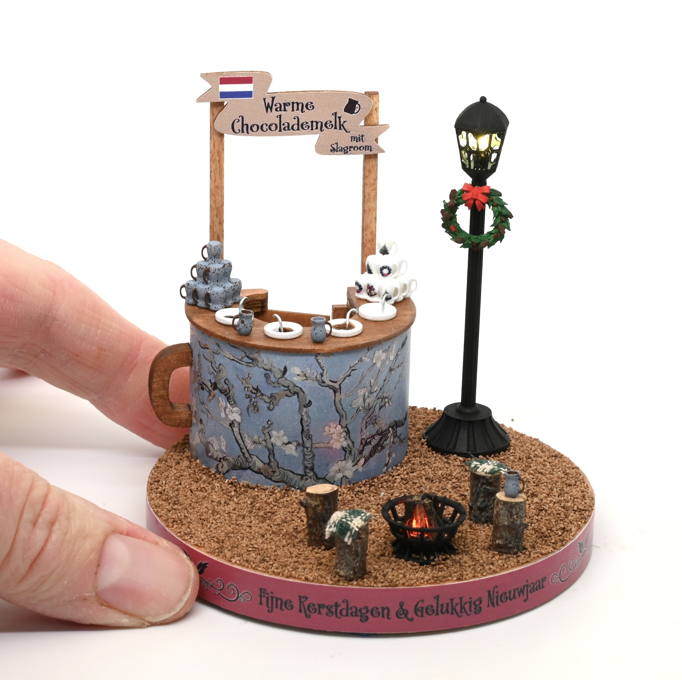 A new tiny 1:48 German Market Stall Kit. Make some cocoa to go! Now you can walk around your Christmas Market with a hot cup of cocoa! Comes with all the items seen in the photo including the LEDs and lighting kit. Detailed color directions come with the kit. This tiny new creation is a lot of fun to make!