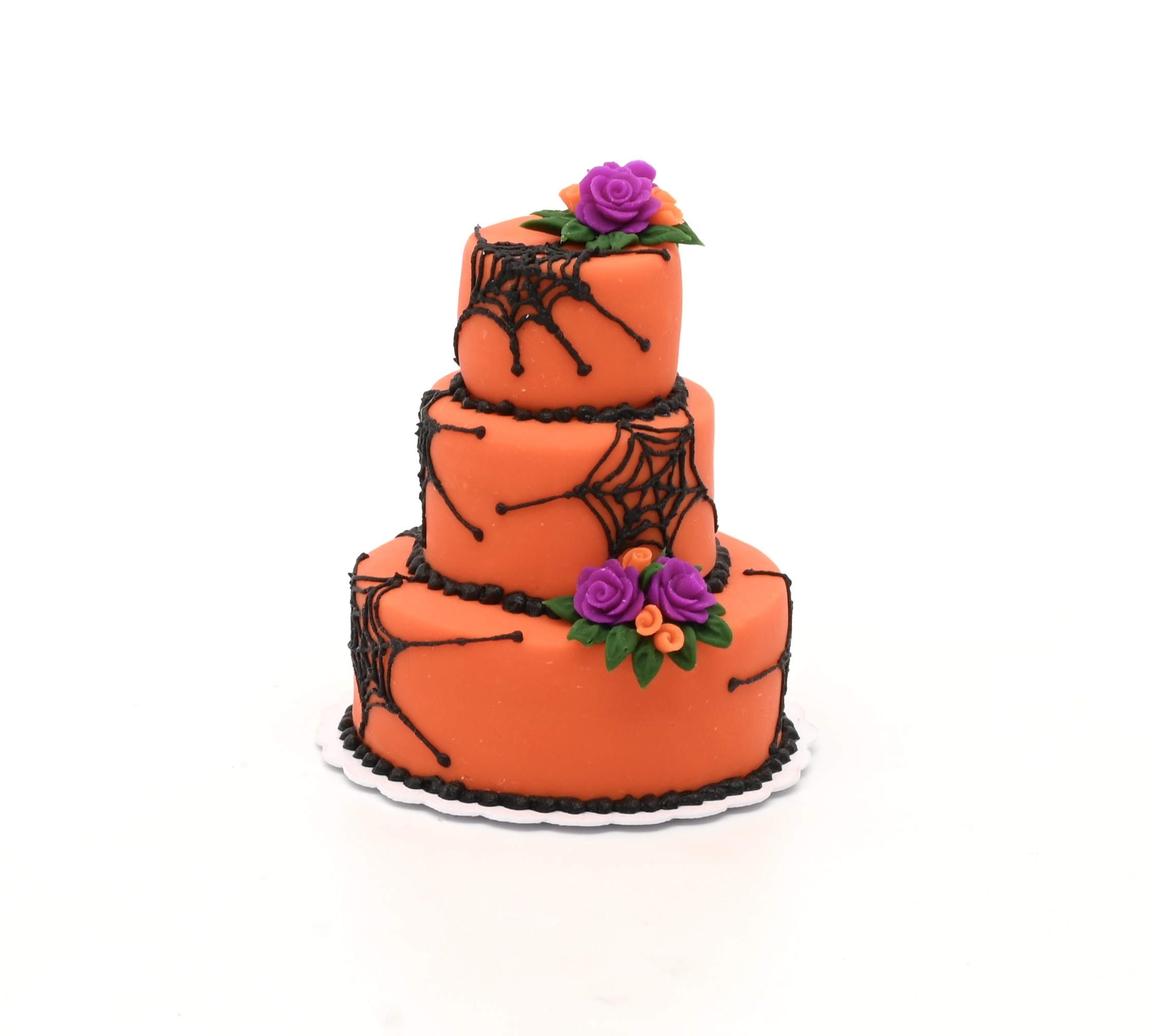 This is a 3 Tier Dollhouse Miniature cake. Each tier is made up of 2 layers of cake and 2 layers of frosting. It can be sliced if you want to. I will send directions on how to slice it if you choose. It's decorated with black spiders webs hand drawn on the cake with my special frosting and handmade purple roses. A really beautiful cake. Fun for any bakery or miniature collection.